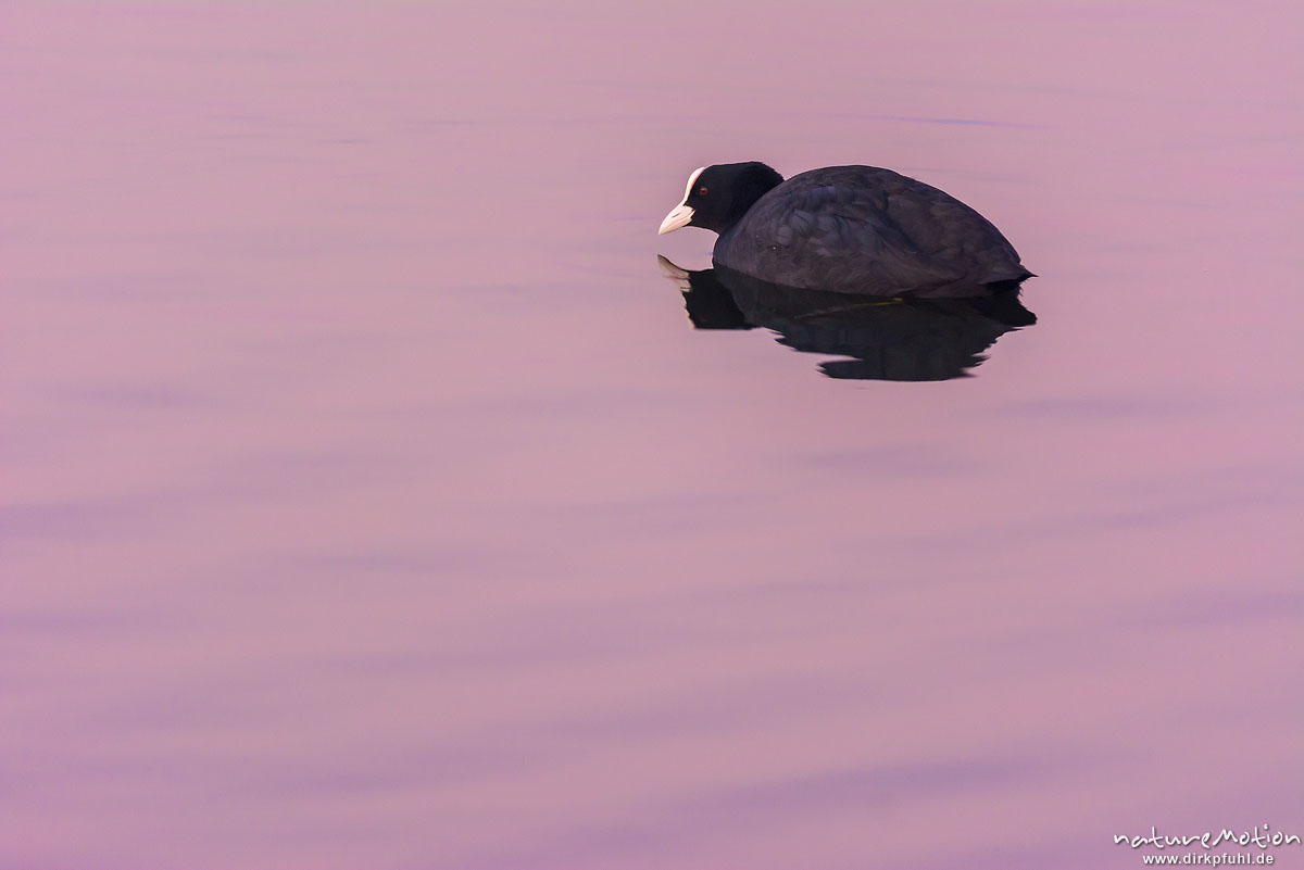 Bläßhuhn, Bläßralle, Fulica atra, Rallidae, schwimmendes Tier, rosafarbene Wasseroberfläche, Seeburger See, Deutschland