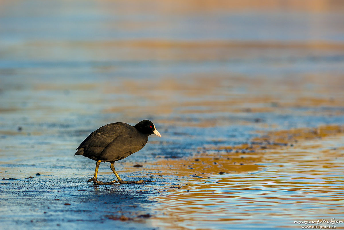 Bläßhuhn, Bläßralle, Fulica atra, Rallidae, Tier auf dem Eis eines fast zugefrorenen Sees, Kiessee, Göttingen, Deutschland