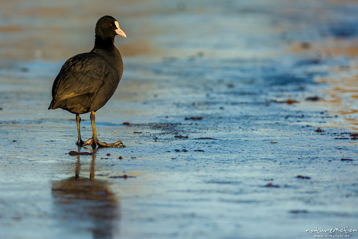 Bläßhuhn, Bläßralle, Fulica atra, Rallidae, Tier auf dem Eis eines fast zugefrorenen Sees, Kiessee, Göttingen, Deutschland