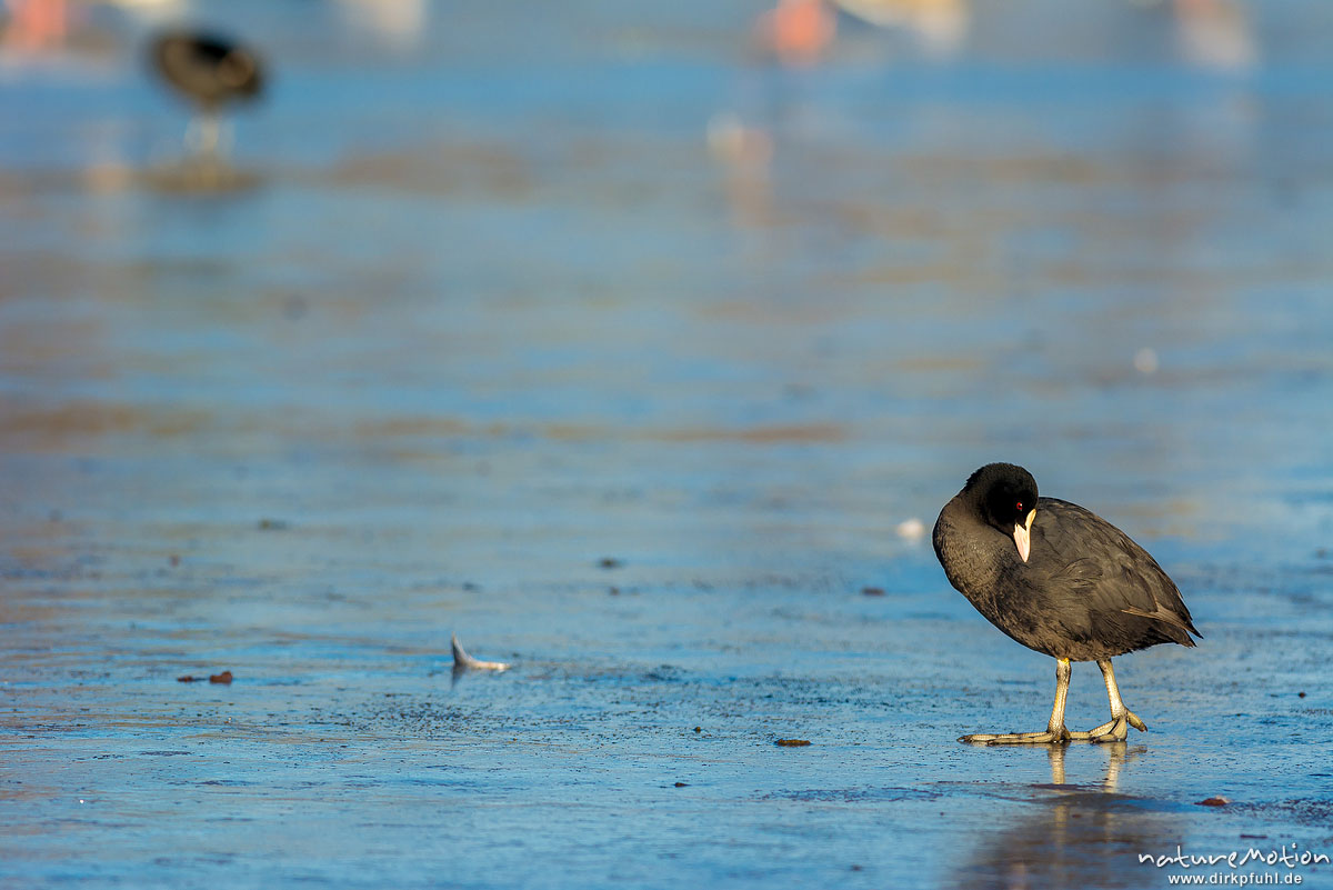 Bläßhuhn, Bläßralle, Fulica atra, Rallidae, Tier auf dem Eis eines fast zugefrorenen Sees, Kiessee, Göttingen, Deutschland