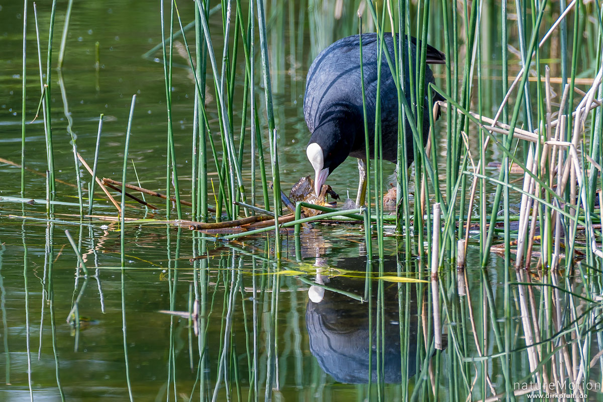 Bläßhuhn, Bläßralle, Fulica atra, Rallidae, Tier beim Nestbau zwischen Binsen, Seeburger See, Deutschland