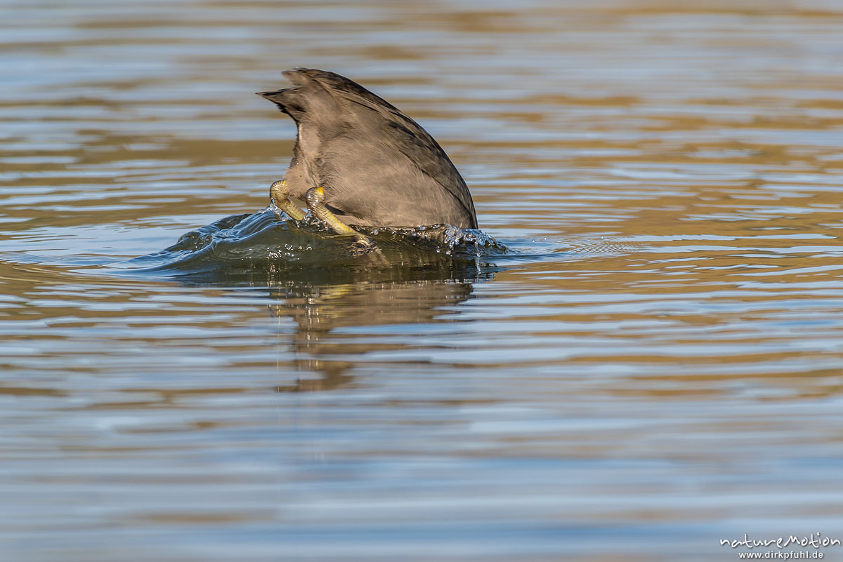 Bläßhuhn, Bläßralle, Fulica atra, Rallidae, Tier taucht nach Nahrung, Göttingen, Deutschland