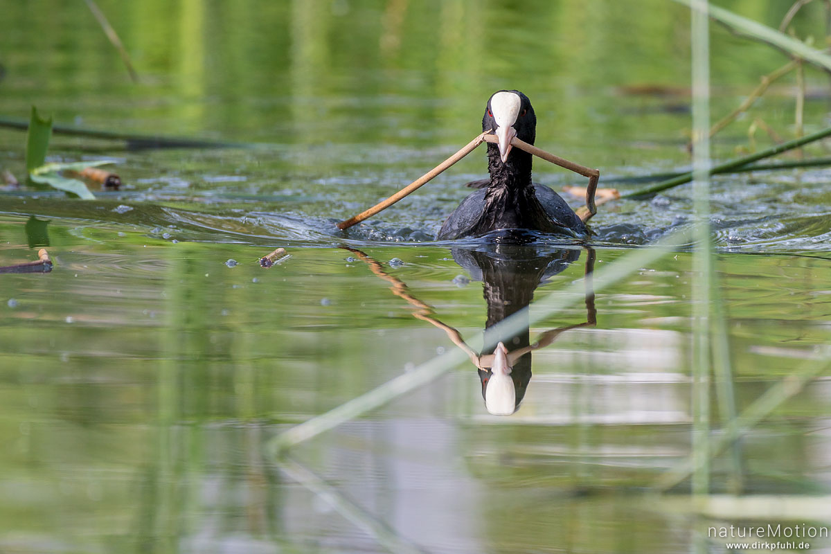 Bläßhuhn, Bläßralle, Fulica atra, Rallidae, Tier transportiert Nistmaterial, Seeburger See, Deutschland