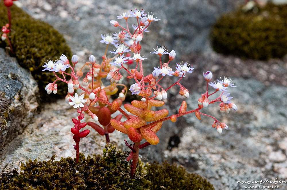 Blauer Mauerpfeffer, Sedum caeruleum, Crassulaceae, zwischen Felsen, Gorche de Spelunca Korsika, Frankreich