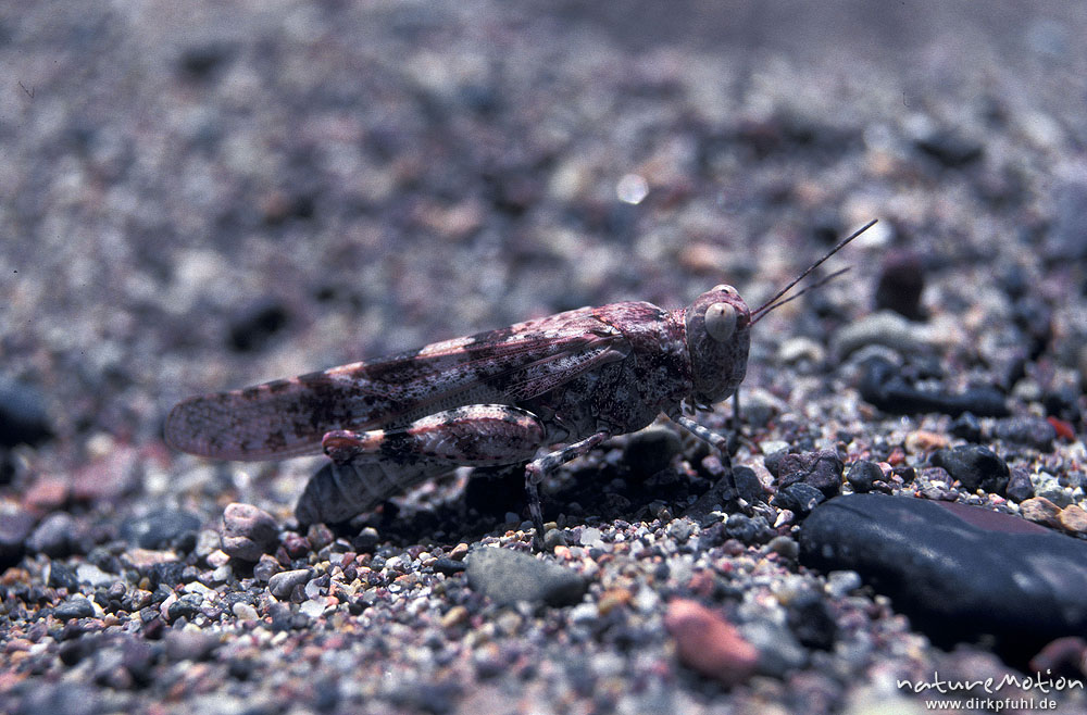 Blauflügelige Sandschrecke, Sphingonotus caerulans, Acrididae, Weibchen, Strand von Galeria Korsika, Frankreich