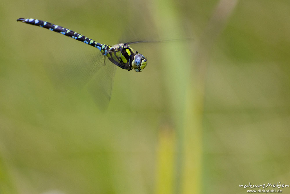 Blaugrüne Mosaikjungfer, Aeshna cyanea, Aeshnidae, Männchen, im Flug, Tripkenpfuhl, Göttingen, Deutschland