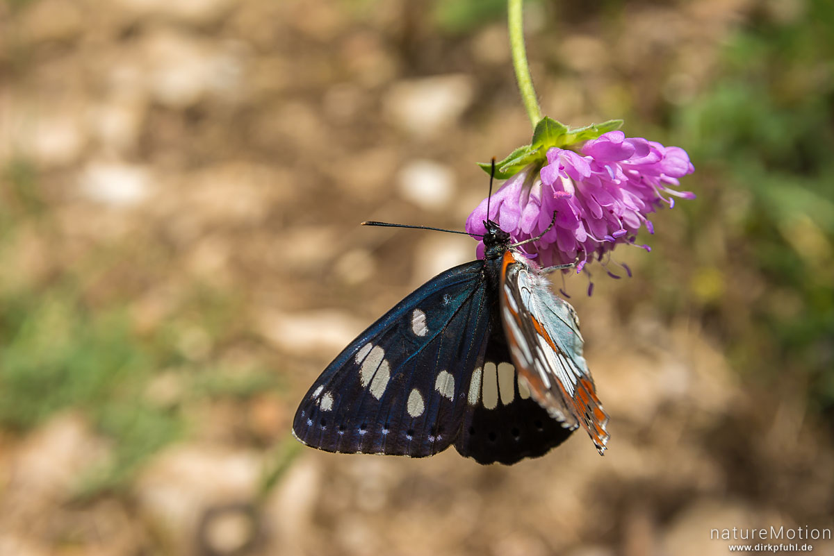 Blauschwarzer Eisvogel, Limenitis reducta, Edelfalter (Nymphalidae), Tier an Blütenstand von Teufelsabbiss, Apt - Provence, Frankreich