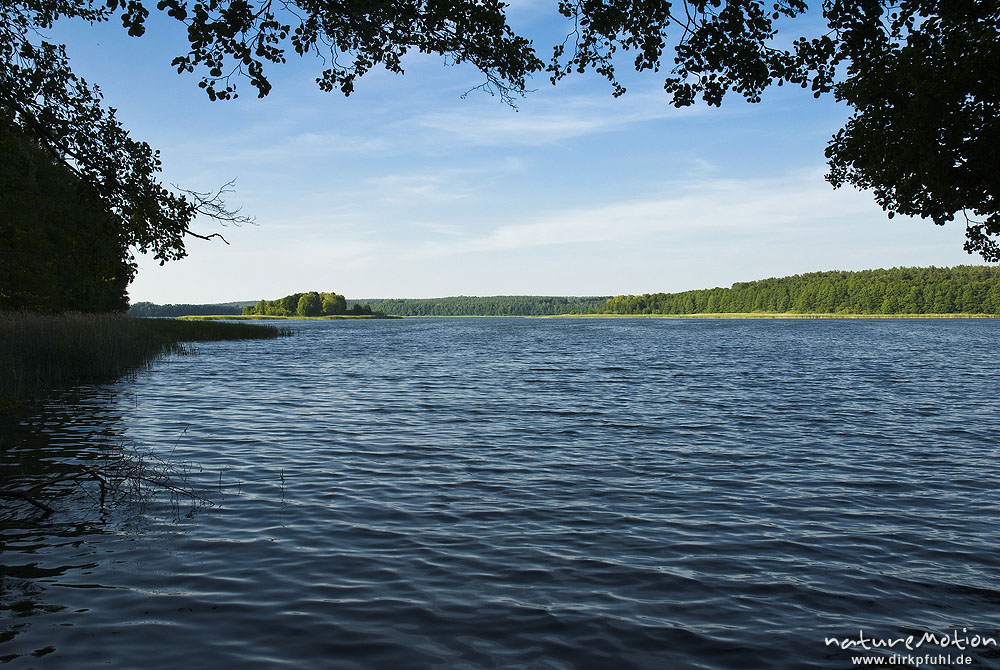 Blick auf den Käbelicksee mit Insel und waldbestandenem Ufer, Kratzeburg, Deutschland