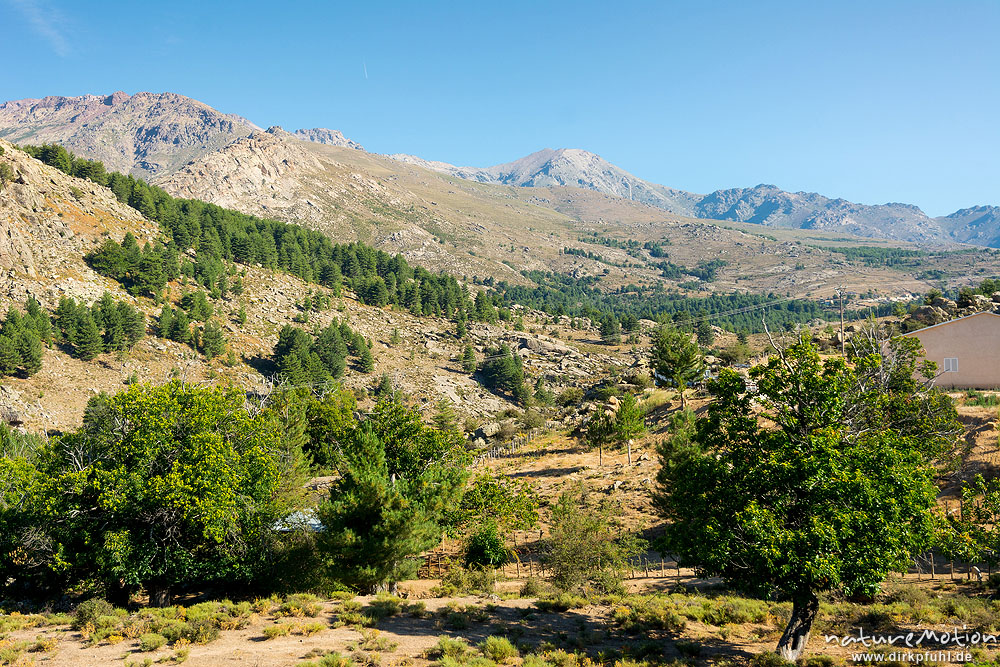 Blick ins Niolu, trockene Vegetation Ende August, bei Albertacce, Korsika, Frankreich