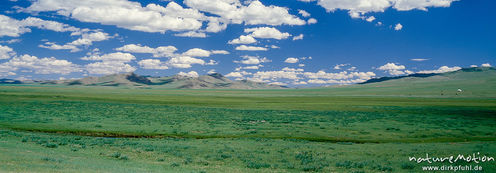 Blick über die Steppe mit bewaldeten Höhenzügen und vereinzelter Jurte (Ger) Changai, Mongolei