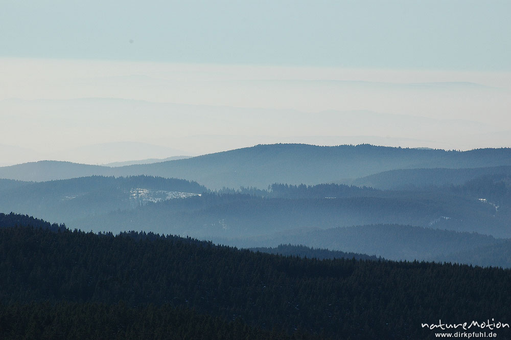 Blick von der Wolfswarte, Fichtenwald, Felsen, Schnee, Dunst, Höhenzüge Harz, Deutschland