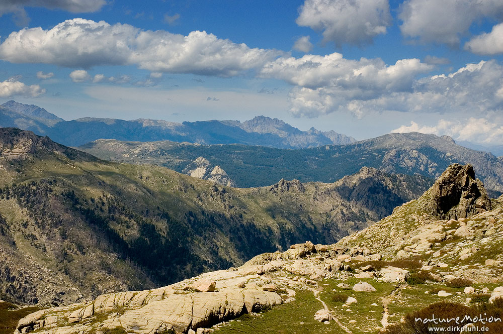 Blick zur Bergerie de Capellacio, im Hintergrund vermutlich der Cima a i Mori, Täler (von vorn nach hinten): Restonica, Tavignano, Golo, Korsika, Frankreich