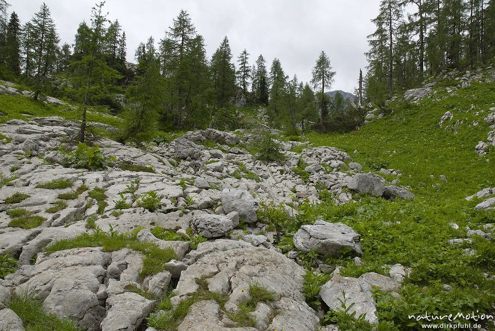 Blockhalde, Kalkfelsen mit lichtem Fichtenwald, Triglav-Nationalpark, Slowenien
