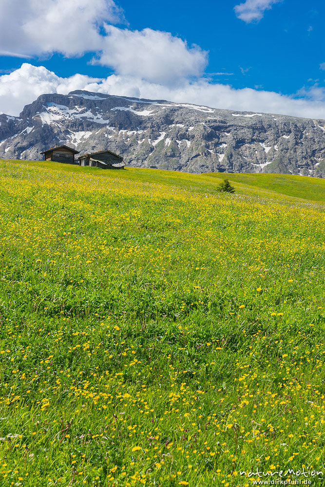 bl?hende Almwiesen, Almh?tten, Berge mit Altschneefeldern, Seiseralm (S?dtirol), Italien