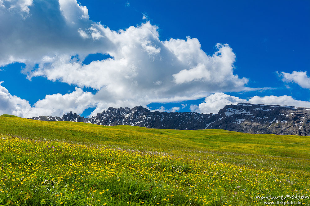 bl?hende Almwiesen, Berge mit Altschneefeldern, Seiseralm (S?dtirol), Italien