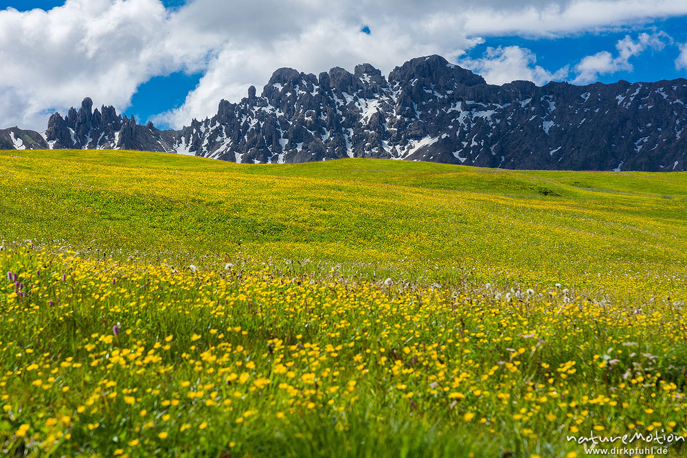 bl?hende Almwiesen, Berge mit Altschneefeldern, Seiseralm (S?dtirol), Italien