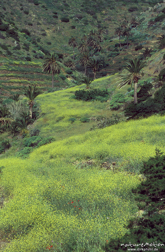 blühende Bergwiesen auf brachliegenden Terrassen, Palmen, Valhermoso, Gomera, Spanien