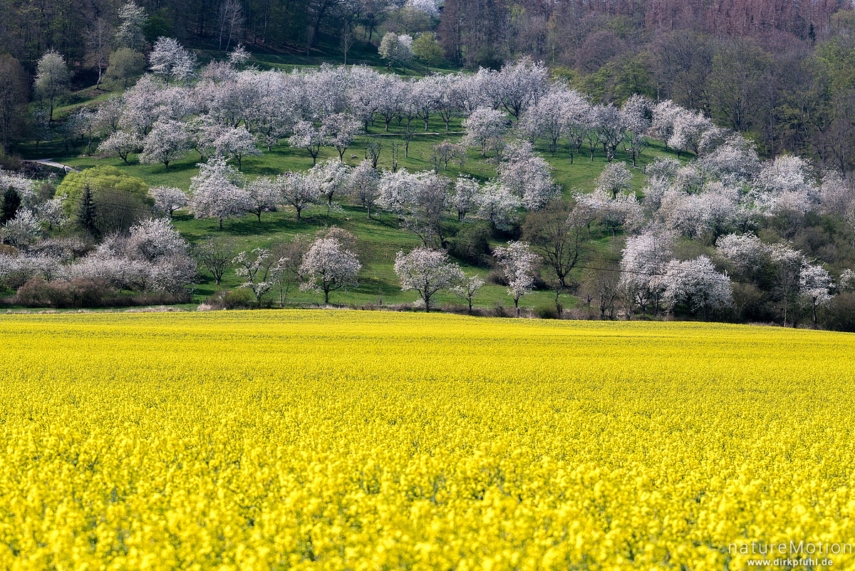 blühende Kirschbäume, Kirschblüte, blühendes Rapsfeld, Wendershausen bei Witzenhausen, Deutschland