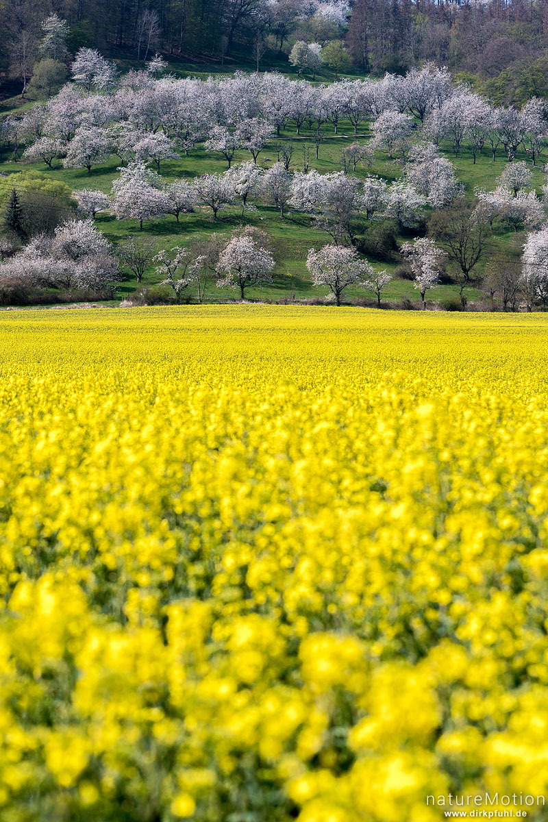 blühende Kirschbäume, Kirschblüte, blühendes Rapsfeld, Wendershausen bei Witzenhausen, Deutschland