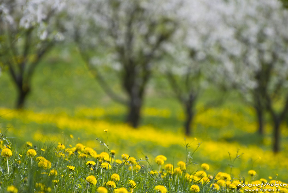 blühende Kirschbäume und Löwenzahn, Schärfe auf Vordergrund Löwenzahnblüten, Wendershausen bei Witzenhausen, Deutschland