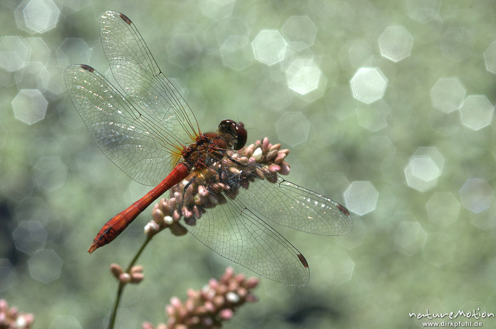 Blutrote Heidelibelle, Sympetrum sanguineum, Männchen, beim Sonnen auf einem Knöterichhalm (Wasser-Knöterich), Lichtreflexe auf der Wasseroberfläche im Hintergrund, Woterfitzsee, Mecklenburger Seen, Deutschland