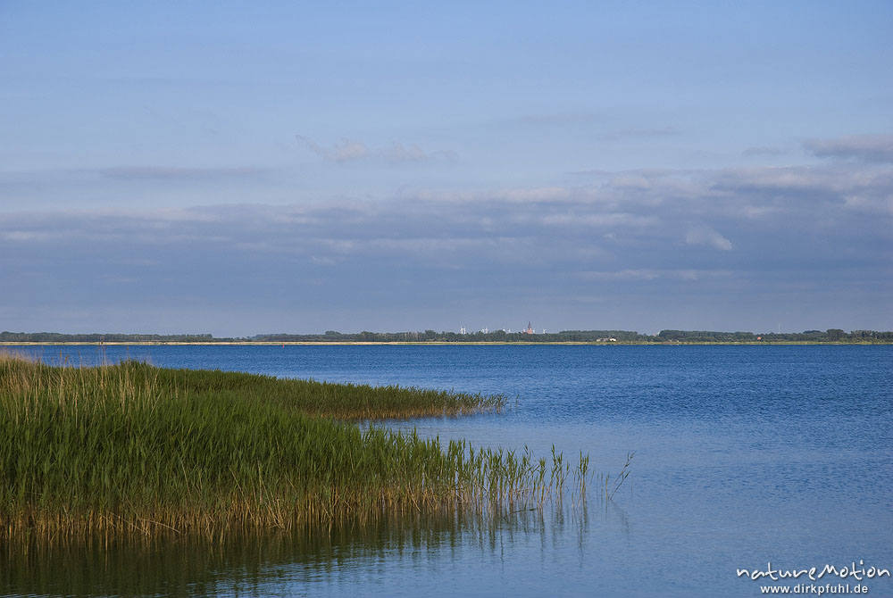 Bodden mit Schilf, Wolken, Abendlicht, im Hintergrund Kirchturm von Barth, Hafen von Wiek, Darß, Zingst, Deutschland