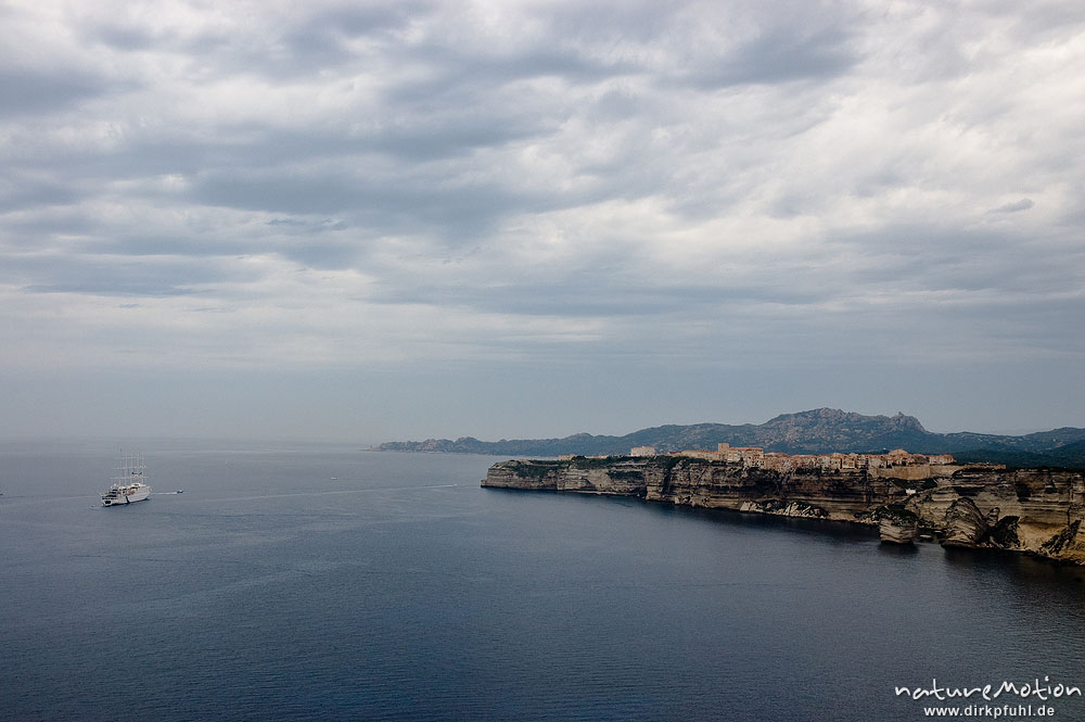 Bonifacio, Altstadt und Felsküste, auf Reede ein Segelkreuzfahrtschiff Korsika, Frankreich
