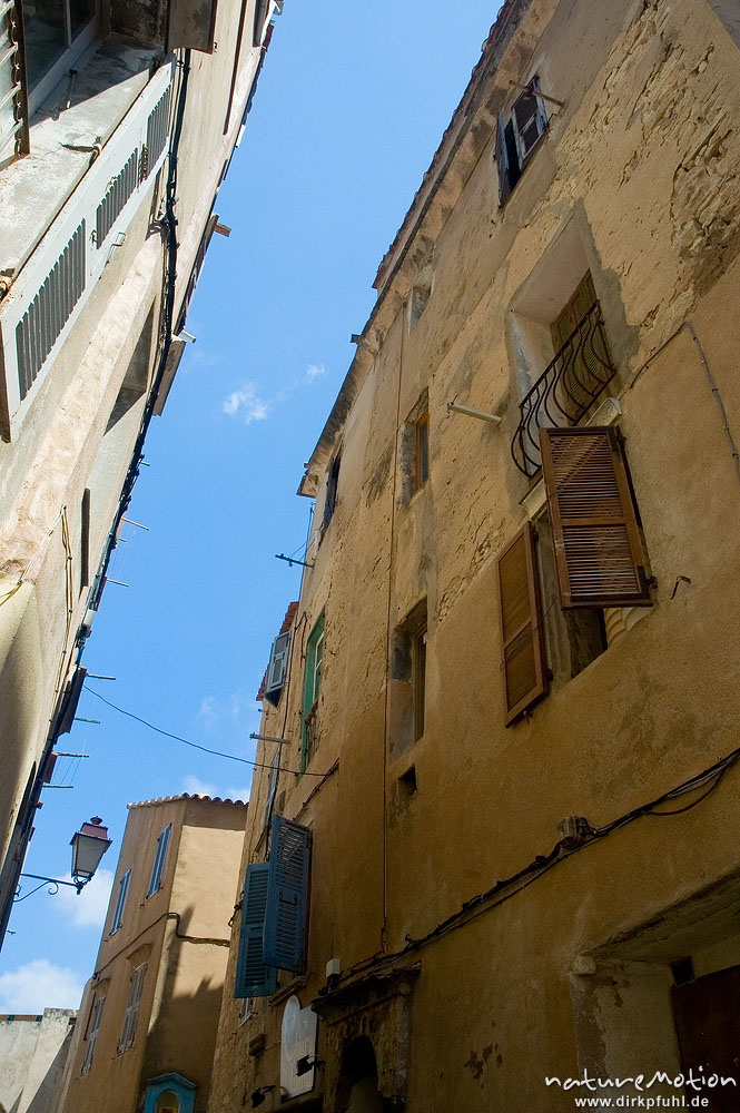 Bonifacio, Hausfassade mit hölzernen Fensterläden, schmale Gasse der Altstadt Korsika, Frankreich