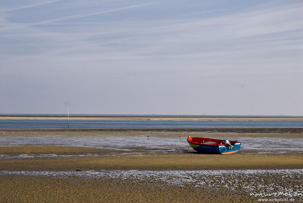 Boot auf Sandbank, Watt bei Ebbe, Hafen von Steenodde, Amrum, Deutschland