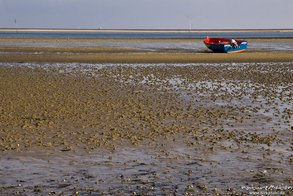 Boot auf Sandbank, Watt bei Ebbe, Hafen von Steenodde, Amrum, Deutschland