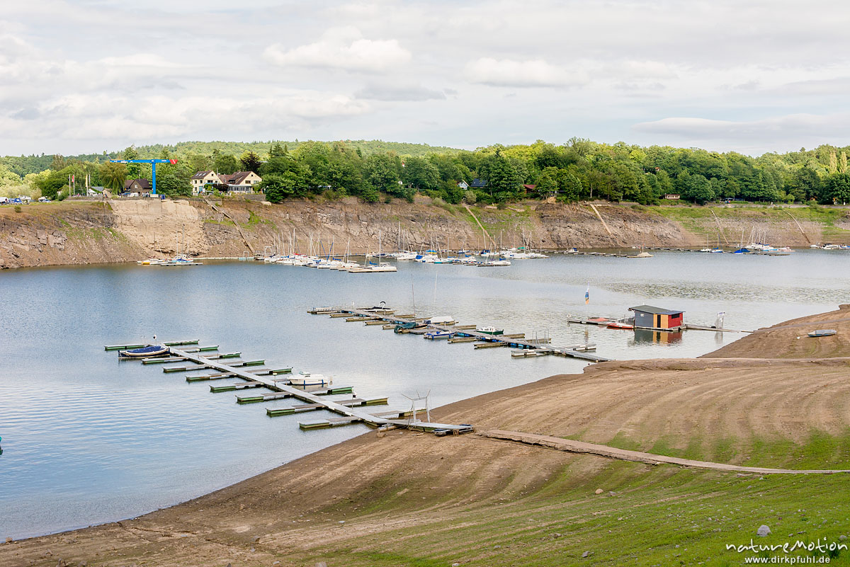 Bootsanleger, Edersee, sehr niedriger Wasserstand, Personenfähre Scheid, Waldeck, Deutschland
