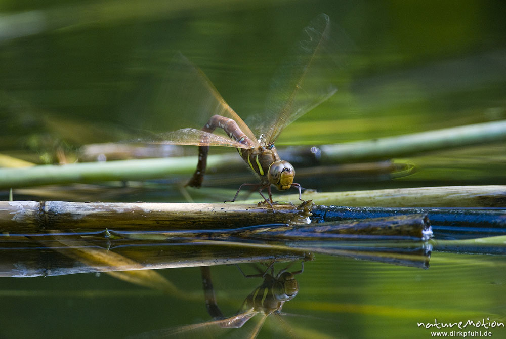 Braune Mosaikjungfer, Aeshna grandis, Edellibellen (Aeshnidae), Weibchen bei der Eiablage in abgestorbene Schilfstängel, Spiegelung in der Wasseroberfläche, Havel, A nature document - not arranged nor manipulated, Babke, Deutschland