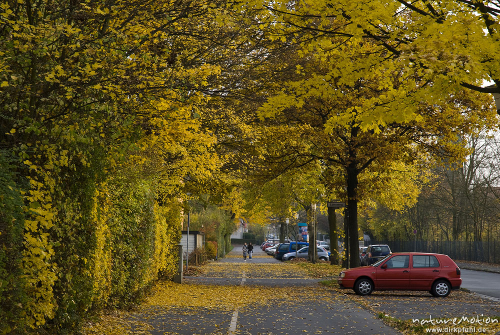 breiter Fußweg, umrahmt von Herbstlaub, Wörthstraße Göttingen, Deutschland