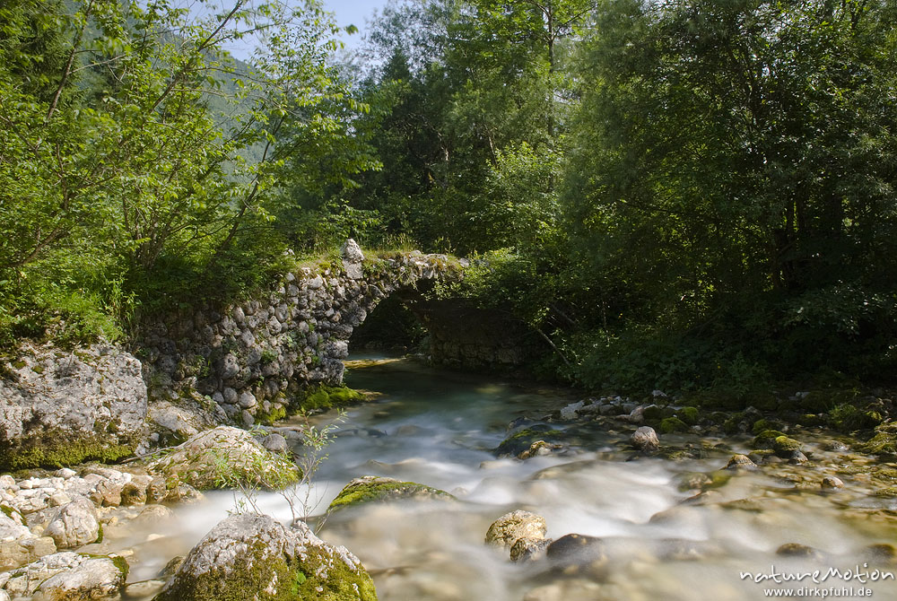 Brücke aus Natursteinen, Tal der Mostnica, Voje, Triglav-Nationalpark, Slowenien