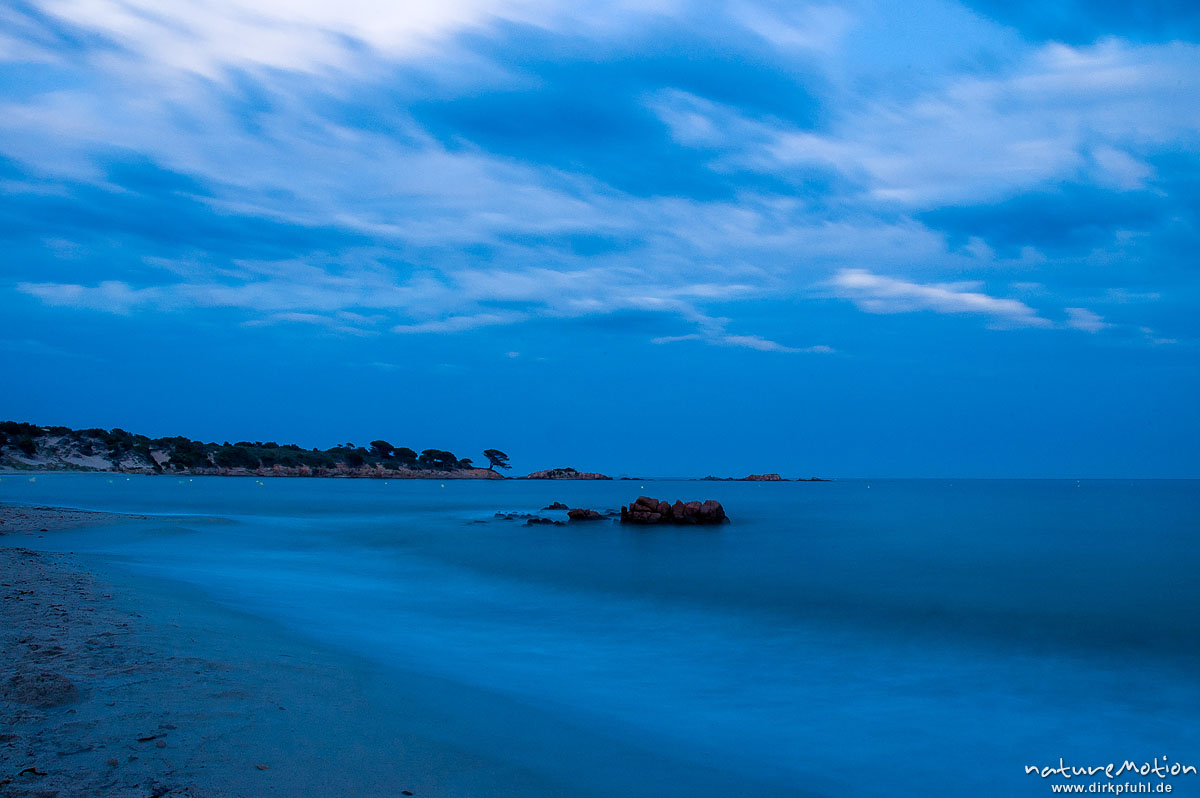 Buch von Asciaghjiu, Strand und Felsen, Wellschlag durch lange Belichtungszeit weichgezeichnet, Korsika, Frankreich