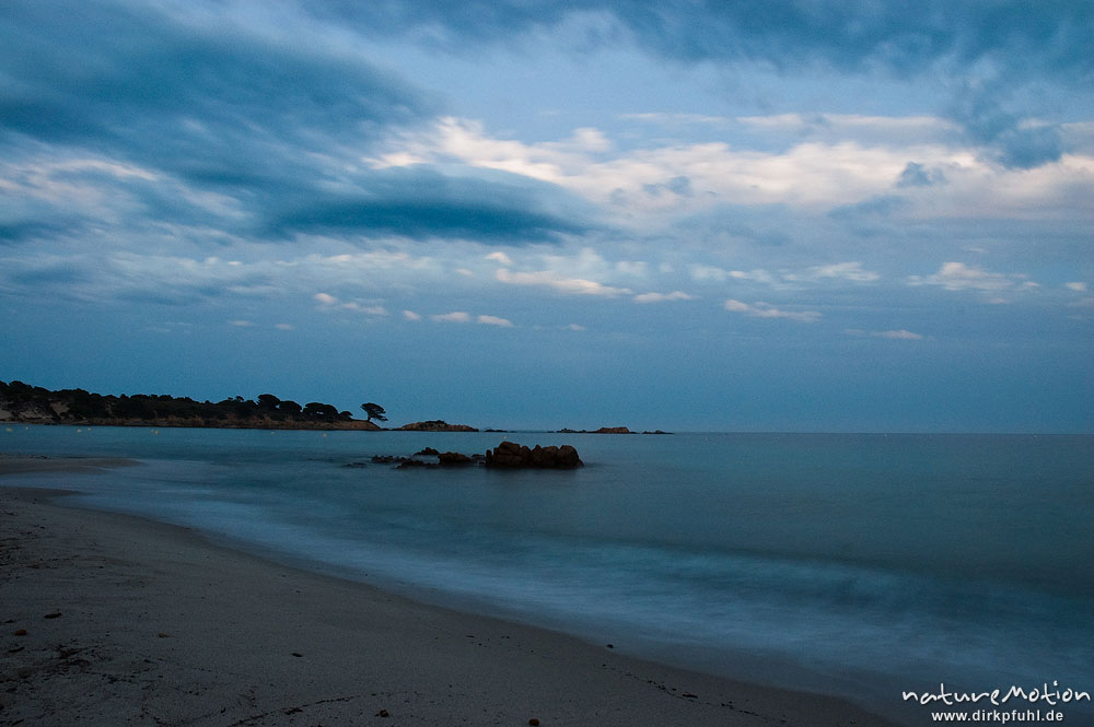 Buch von Asciaghjiu, Strand und Felsen, Wellschlag durch lange Belichtungszeit weichgezeichnet Korsika, Frankreich