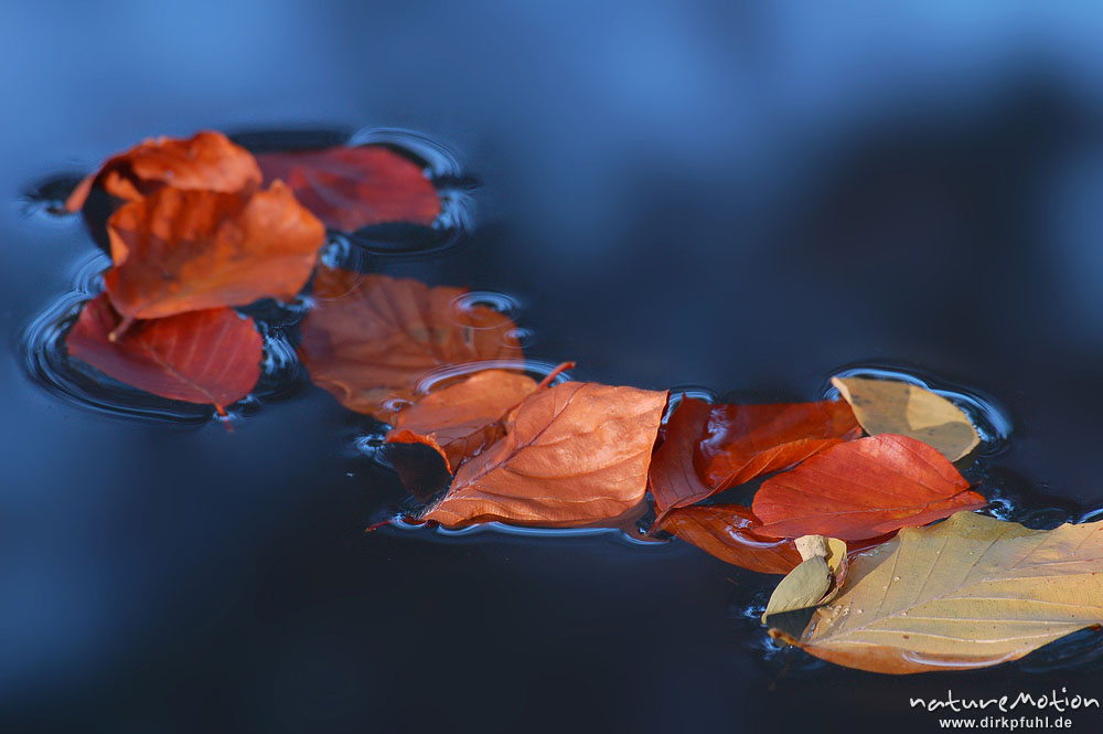 Buchenblätter auf blauer Wasseroberfläche, Oberflächenspannung gut sichtbar, leider mangelnde Schärfentiefe, Schillerwiese, Göttingen, Göttingen, Deutschland