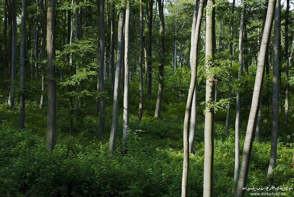 Buchenstämme im Abendlicht, Rotbuche, Fagus sylvatica, Göttinger Wald, Göttingen, Deutschland