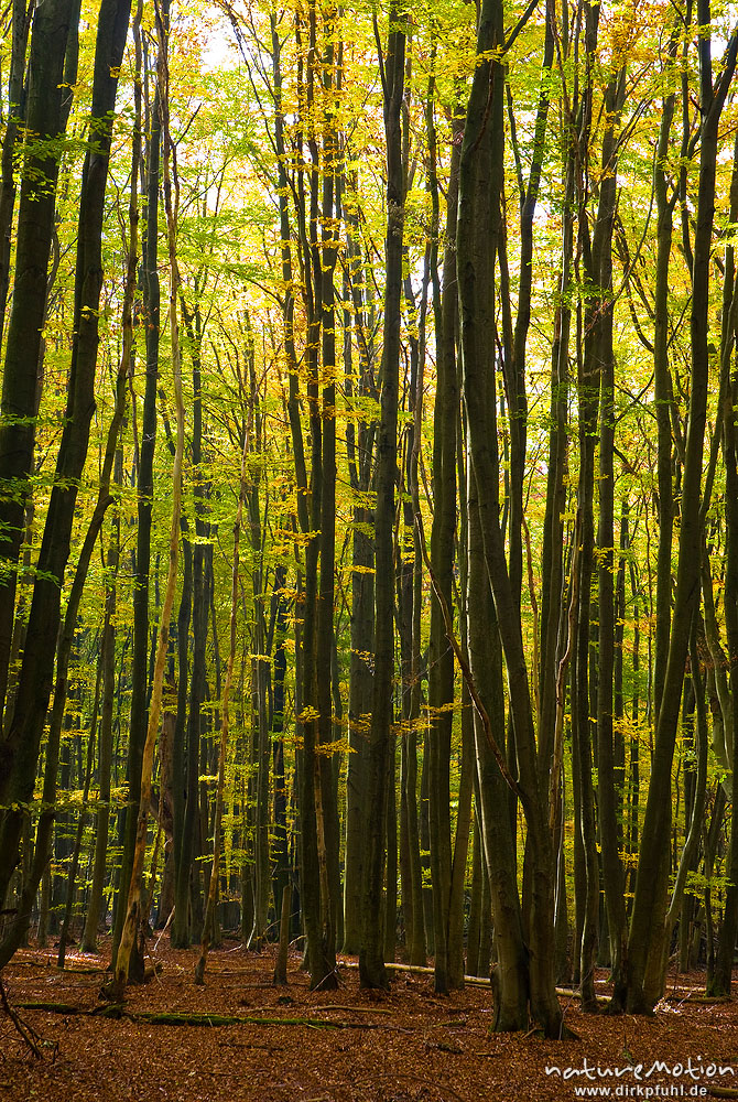 Buchenstämme mit Herbstlaub, dicht geplanzter und wenig durchforsteter Hochwald, Urwald Sababurg, Deutschland
