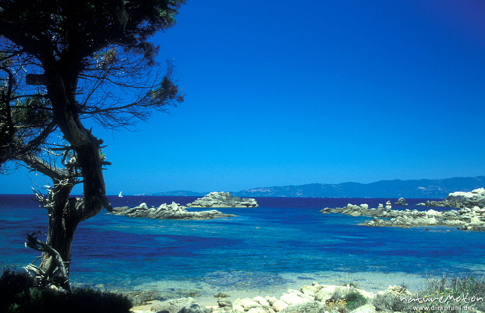 Bucht mit blauem Wasser und Kiefer, Küste bei Campomoro, Korsika, Frankreich