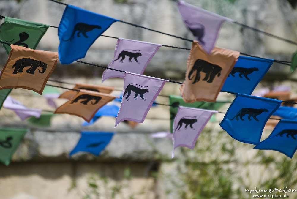 bunte Fahnen mit Tiermotiven, an Schnüren über Platz, Elefantengehege, Zoo Hannover Hannover, Deutschland