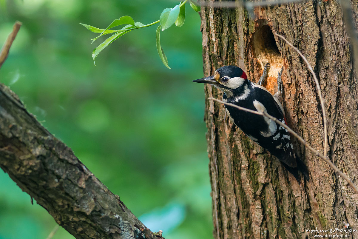 Buntspecht, Dendrocopos major, Spechte (Picidae), Alttier an Bruthöhle, füttert Jungtier, Levinscher Park, Göttingen, Deutschland