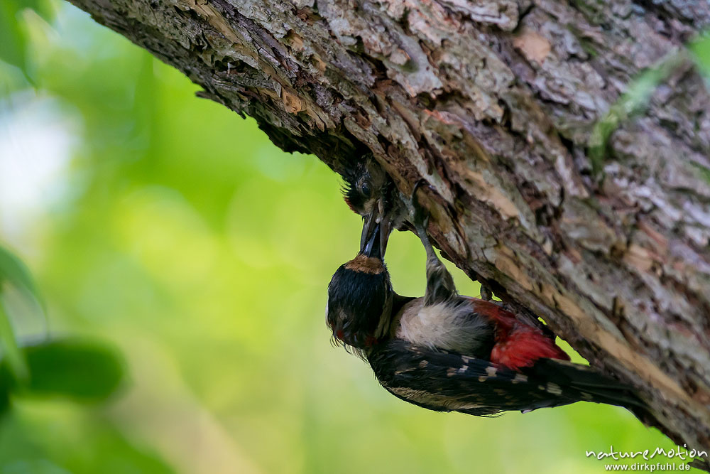 Buntspecht, Dendrocopos major, Spechte (Picidae), Bruthöhle mit Jungtier, Altvogel füttert, Kiessee, Göttingen, Deutschland