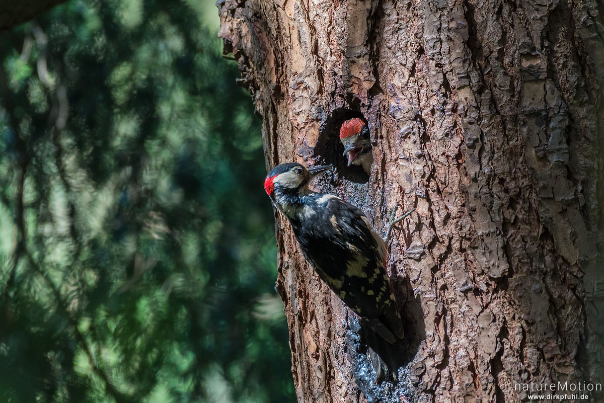 Buntspecht, Dendrocopos major, Spechte (Picidae),Alttier an der Nisthöhle, füttert Küken, Stadtfriedhof, Göttingen, Deutschland