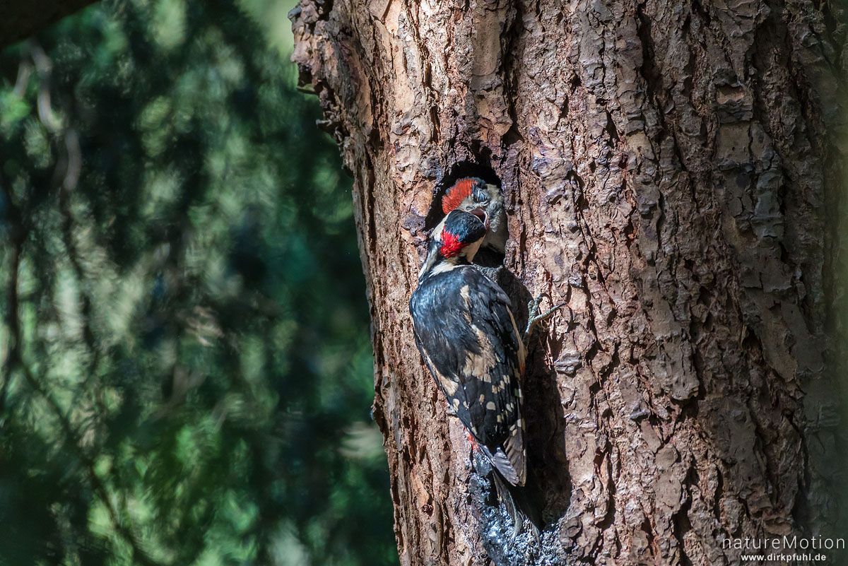 Buntspecht, Dendrocopos major, 	Spechte (Picidae),Alttier an der Nisthöhle, füttert Küken, Stadtfriedhof, Göttingen, Deutschland