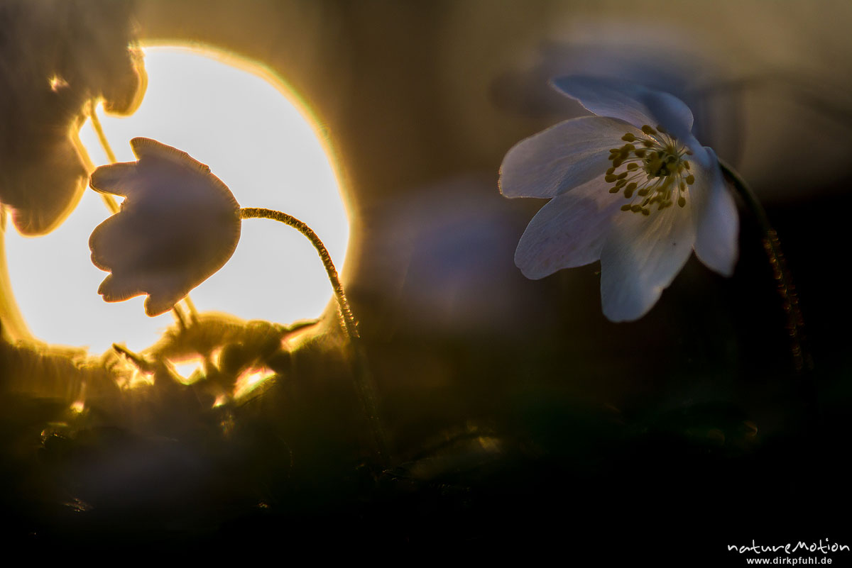 Buschwindröschen, Anemone nemorosa, Ranunculaceae, Blüten, im Gegenlicht der untergehenden Sonne, Kehr, Göttingen, Deutschland