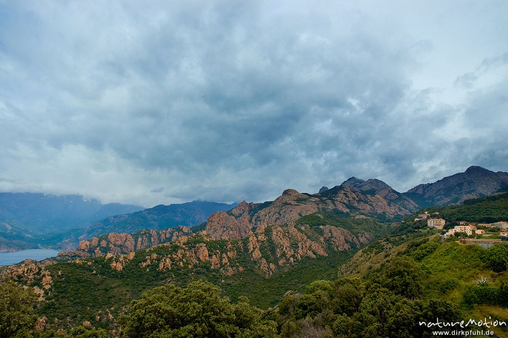 Calanche bei Piana, Regenwolken, Korsika, Frankreich