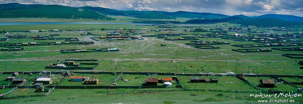Chatgal am Ufer des Chowsgöl Nuur, Holzhäuser, durch hohe Zäune abgegrenzte Grundstücke, Chatgal, Mongolei