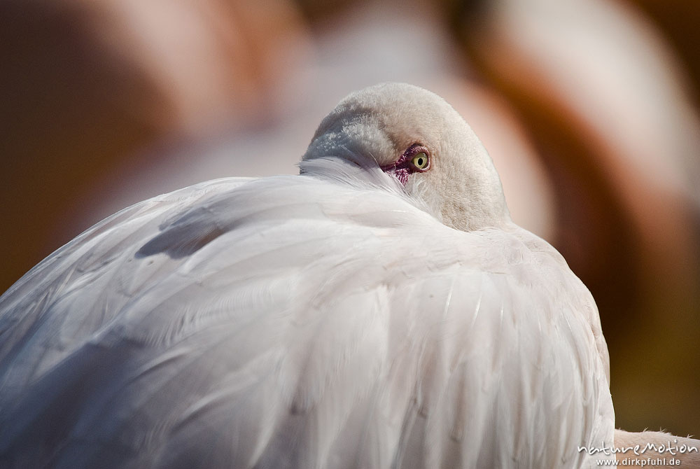 Chileflamingo, Chilenische Flamingo, Phoenicopterus chilensis, Flamingos (Phoenicopteridae), ruhendes Tier, Kopf steckt im Gefieder, Zoo Hannover, Hannover, Deutschland
