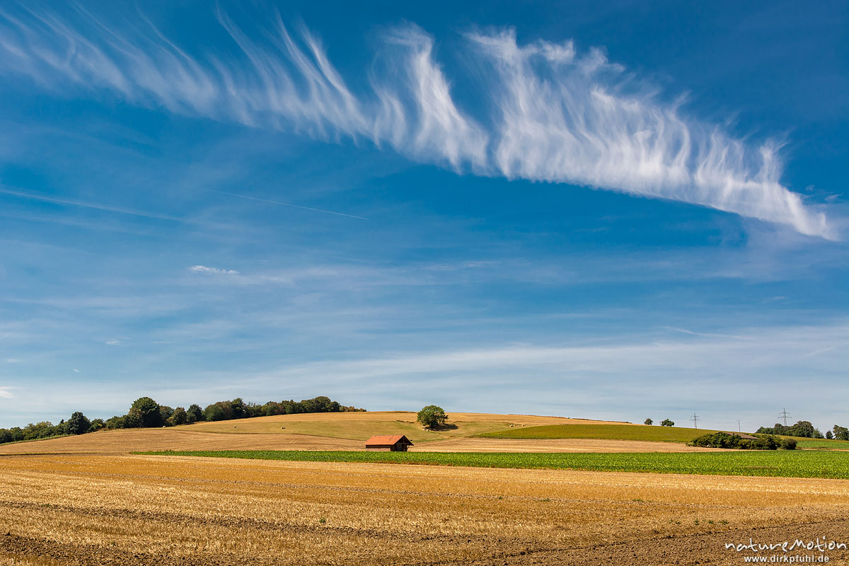 Cirrus fibratus, aus einem Kondesstreifen entstandene Federwolke über abgeernteten Fledern, Felsberg, Deutschland